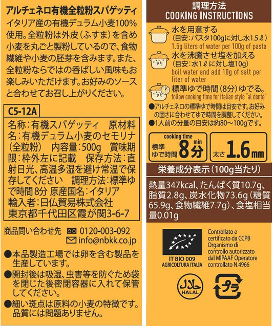 ALCE NERO(アルチェネロ) 有機 全粒粉 スパゲッティ (オーガニック イタリア産 食物繊維 胚芽 太さ1.6mm) 500グラム